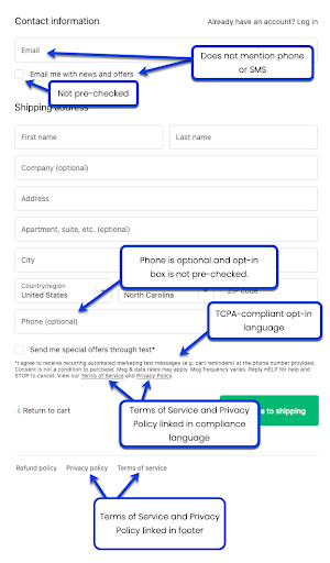 If you’re adamant about having email collection and SMS collection on the same page or popup, then you must have separate consent (unchecked) checkboxes for each submission field (email and SMS), separate compliance disclosure language next to each, and the ability for the subscriber to submit the form with either field left blank.